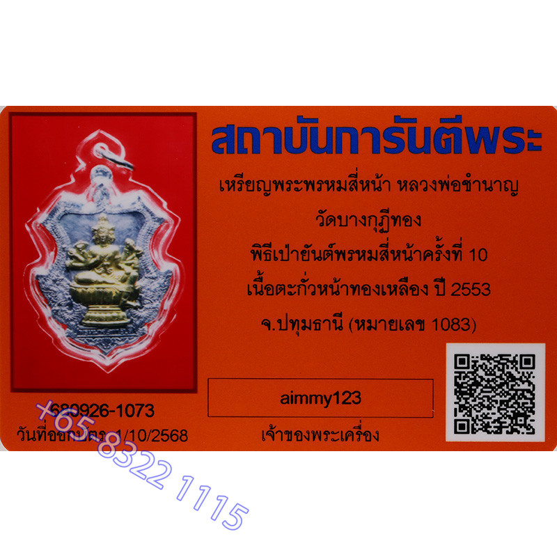 • 做1553尊,编号:1083,龙婆禅南加持佛历2553大法会,四面佛TaKua弹壳4.5cm G-Pra 证书